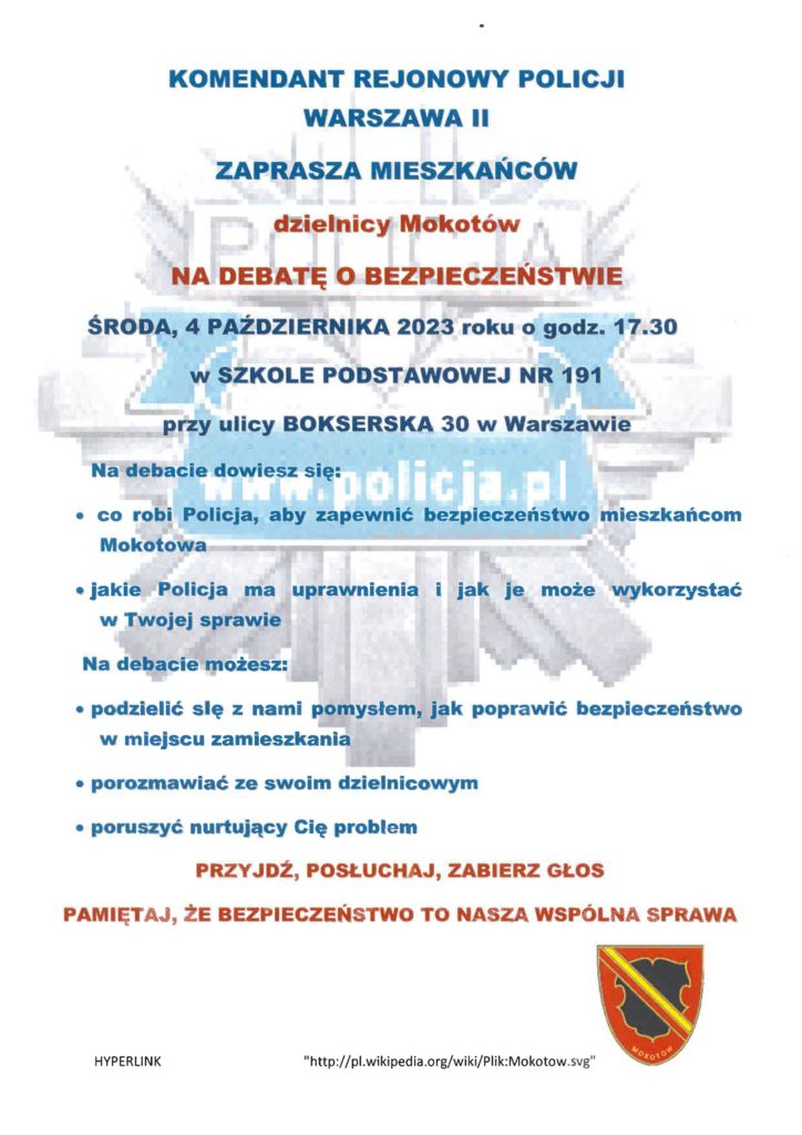 ZAPROSZENIE MIESZKAŃCÓW DZIELNICY WARSZAWA MOKOTÓW NA DEBATĘ Z KOMENDANTEM REJONOWYM POLICJI