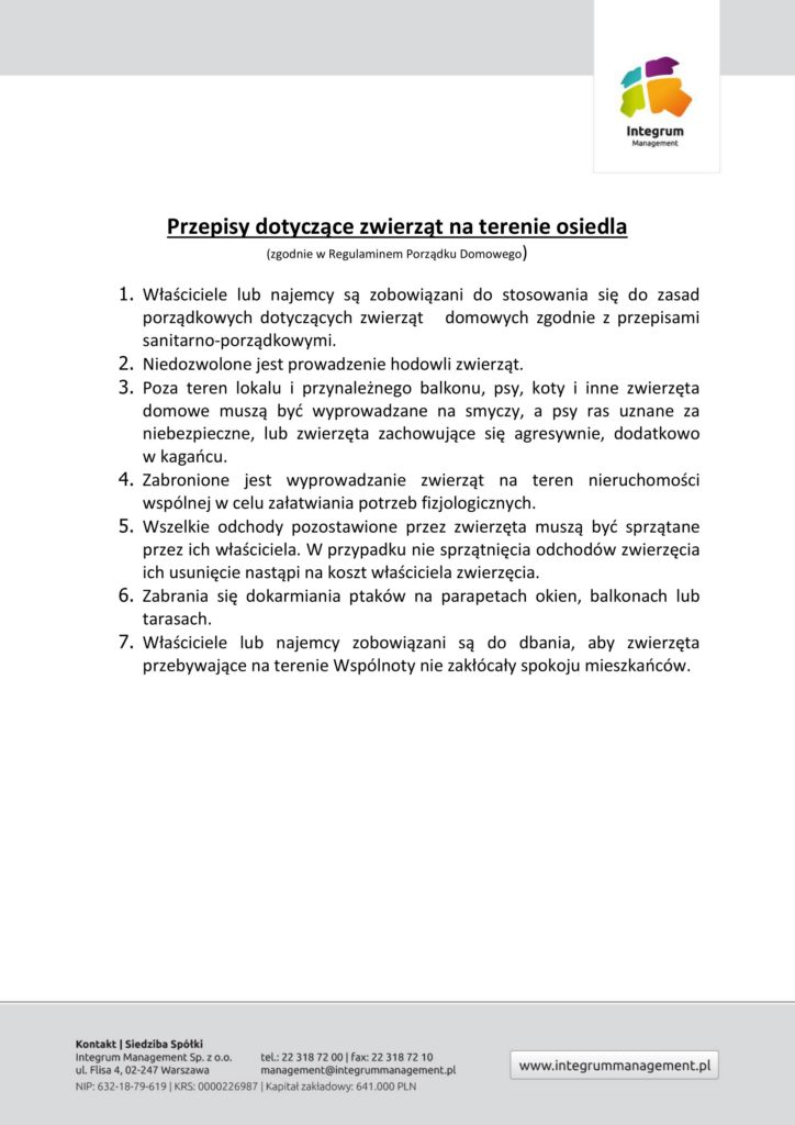 Zgodnie w Regulaminem Porządku Domowego przypominamy przepisy dotyczące zwierząt na terenie osiedla